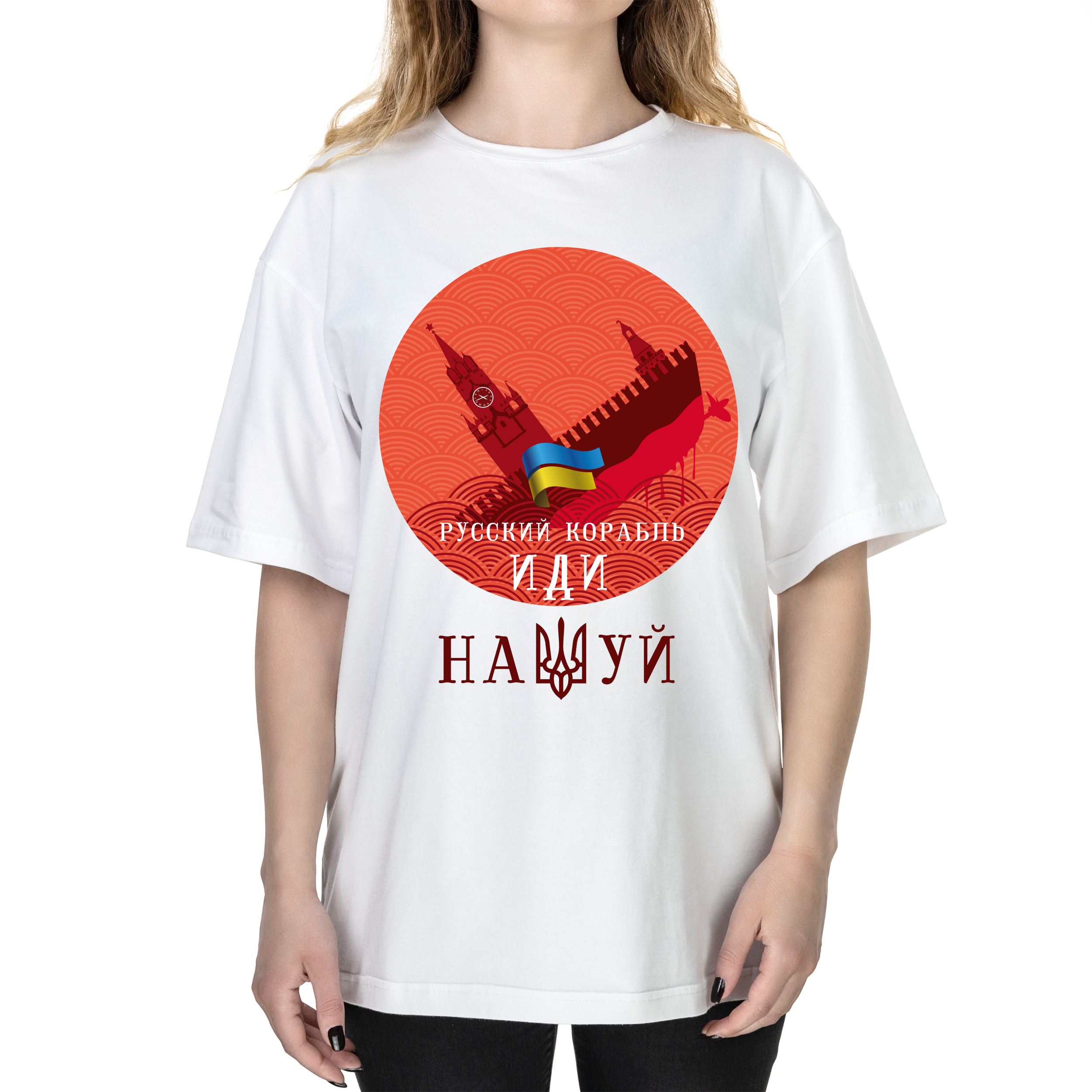 Футболка женская оверсайз белая хлопок/эластан Русский корабль иди на*уй XXL