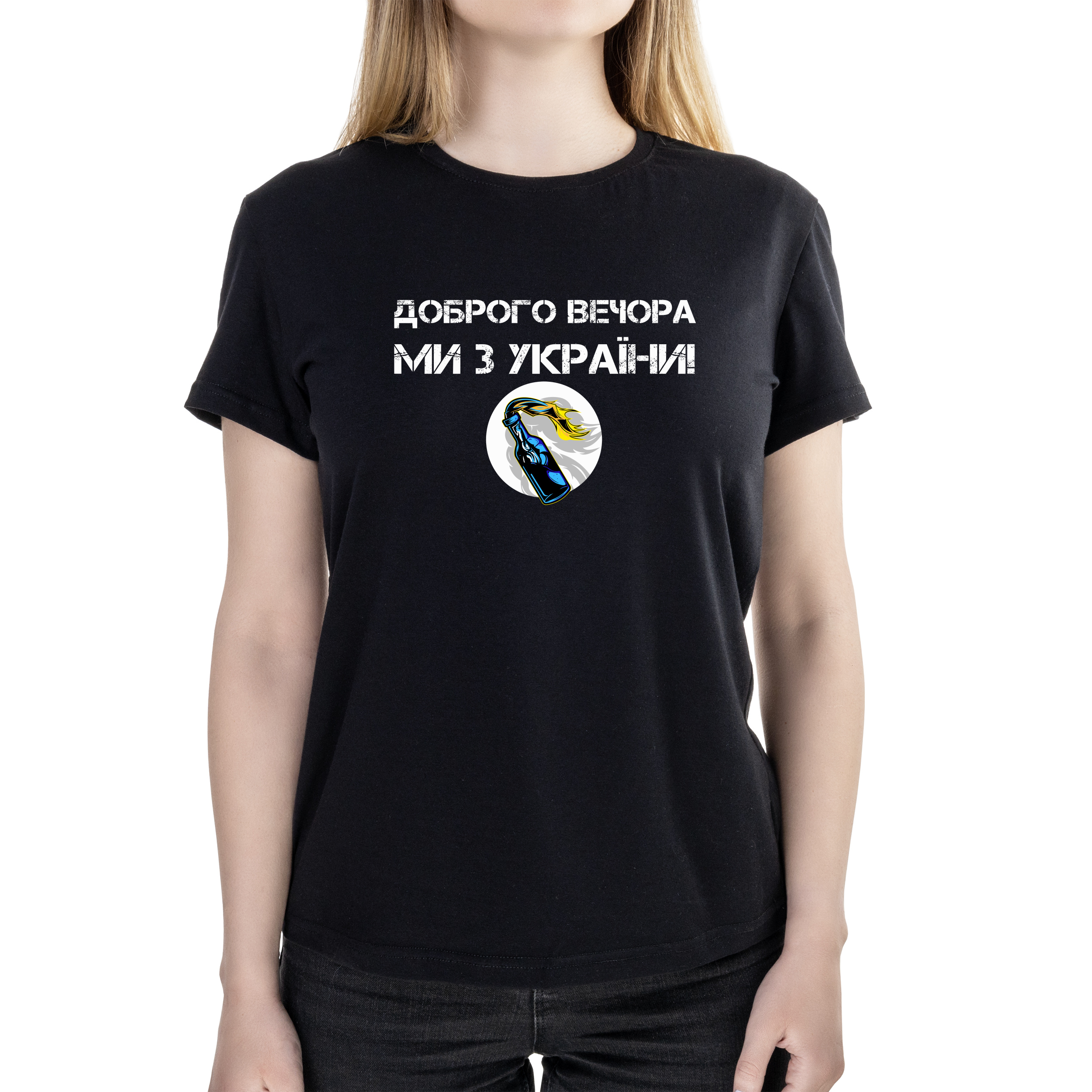 Футболка женская полуприталённая черная хлопок/эластан А4 размера Доброго вечора, ми з України! Молотов XXXL