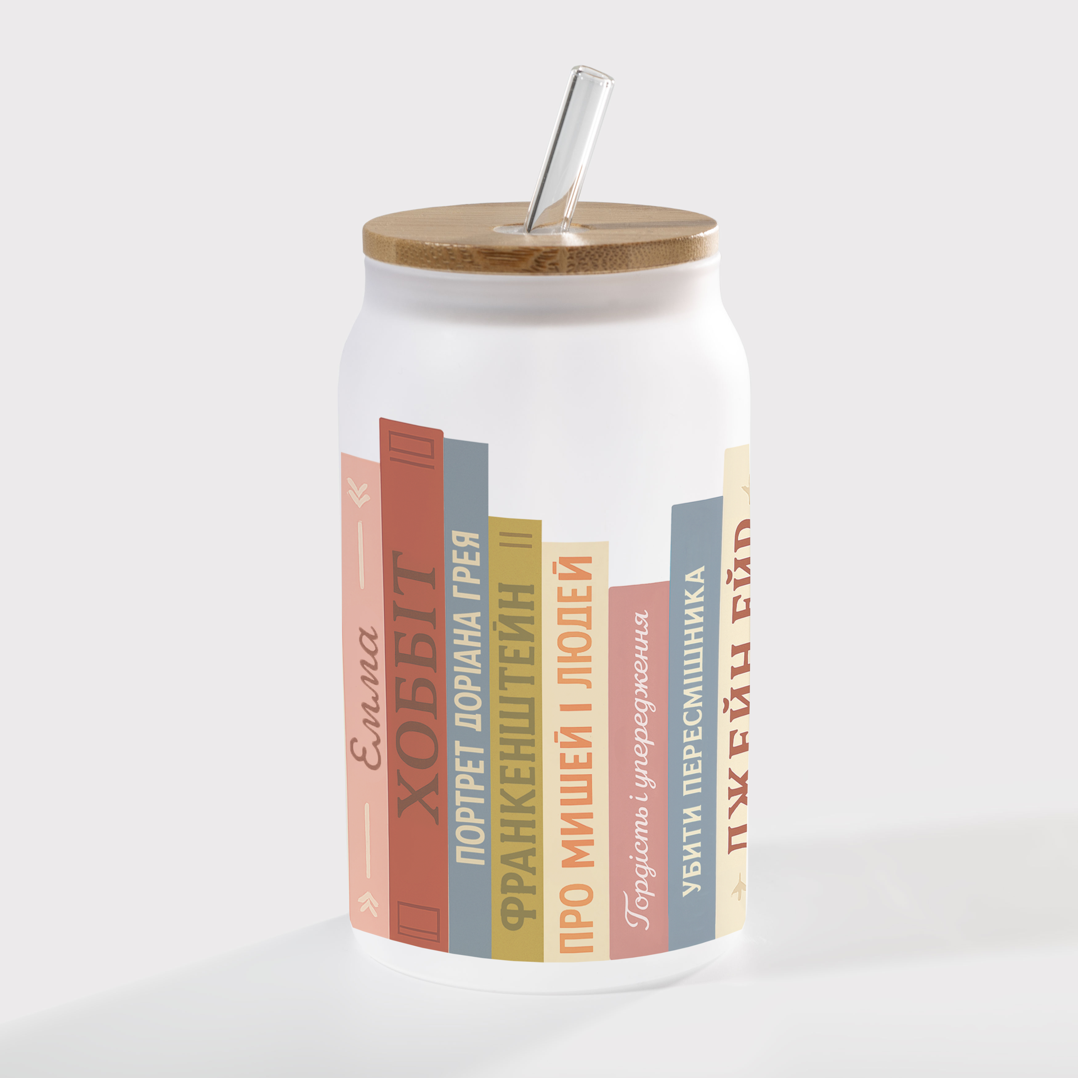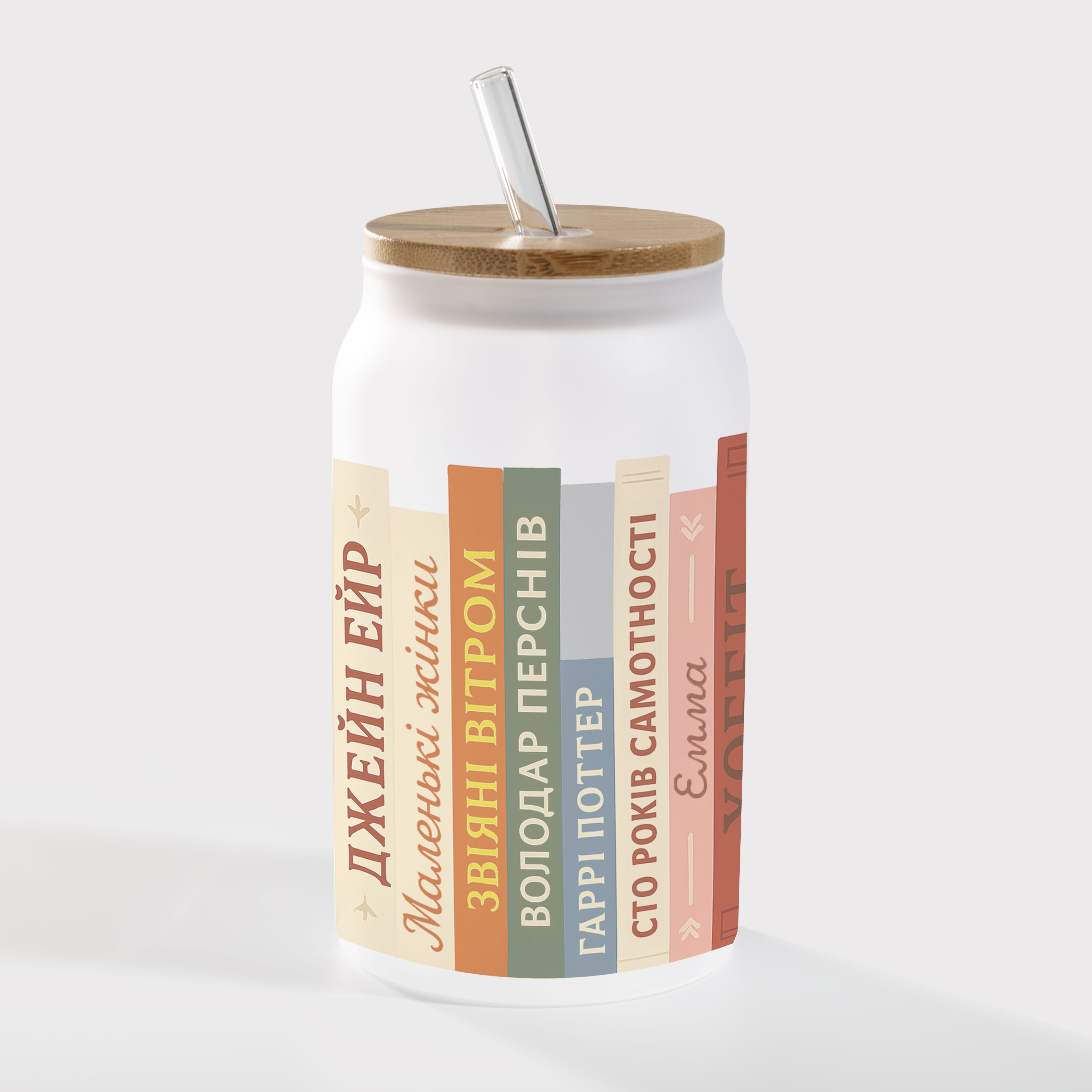 Банка со стеклянной трубочкой и деревянной крышкой стеклянная матовая (450 мл) Книжная вселенная