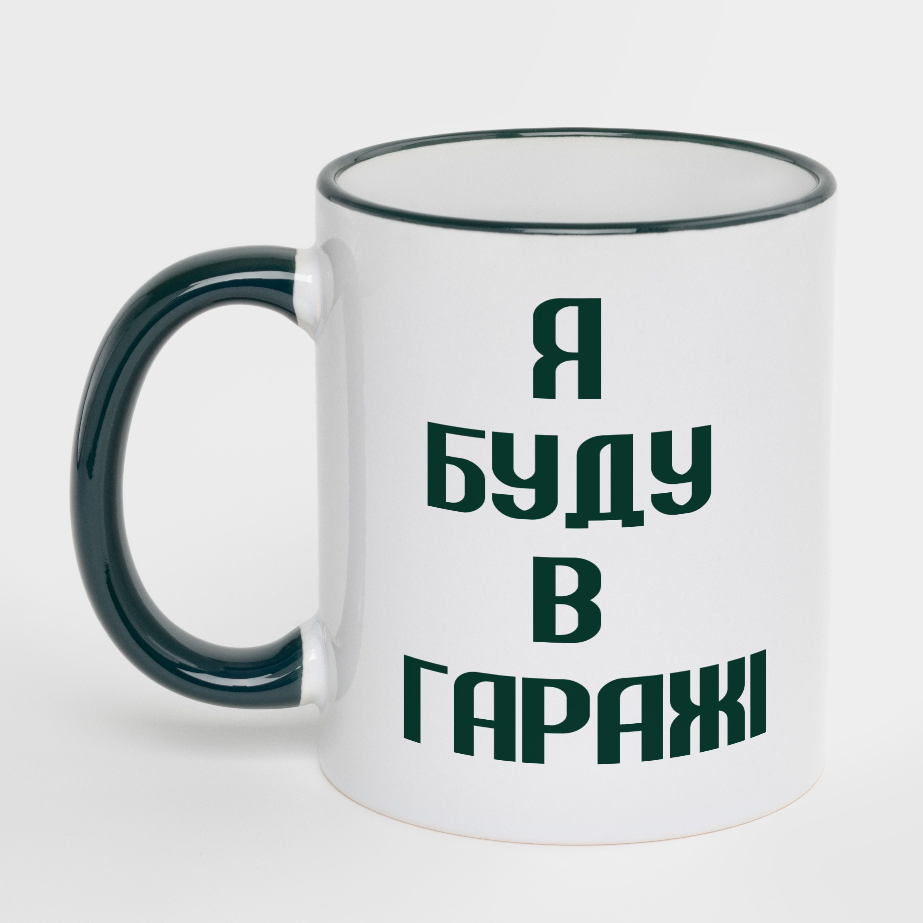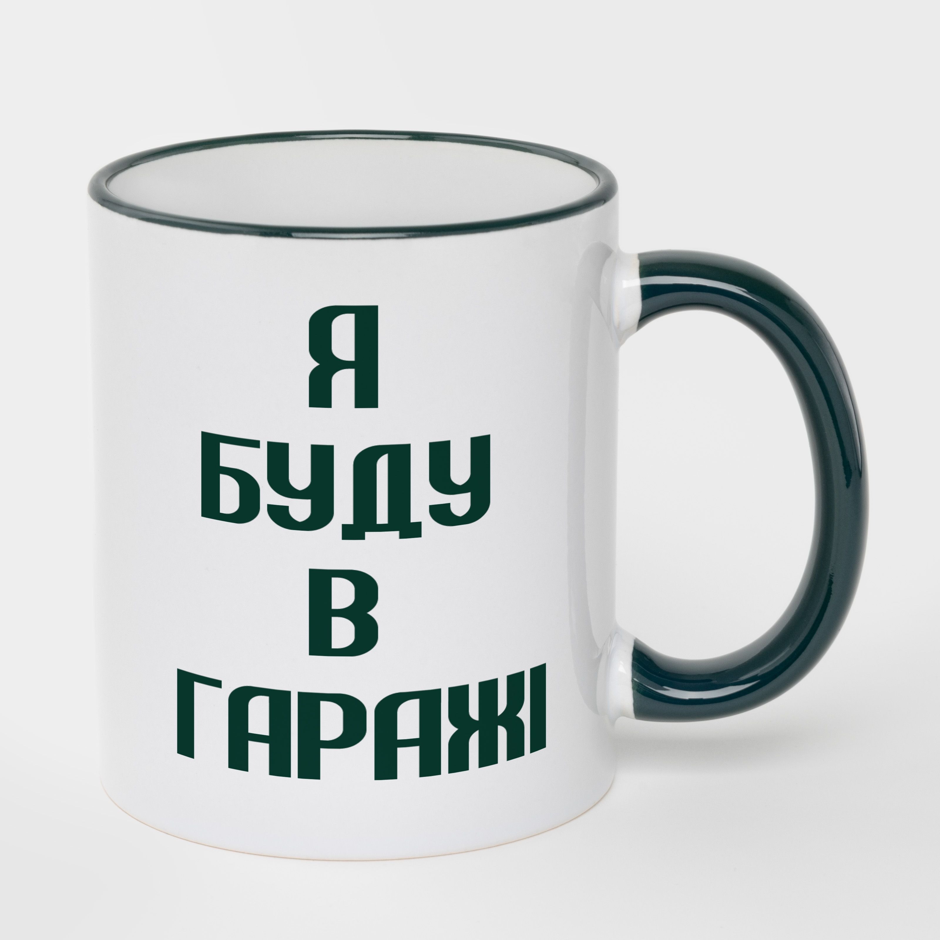 Кружка с темно-зеленым ободком и темно-зеленой ручкой ручкой (330 мл) Я буду в гараже