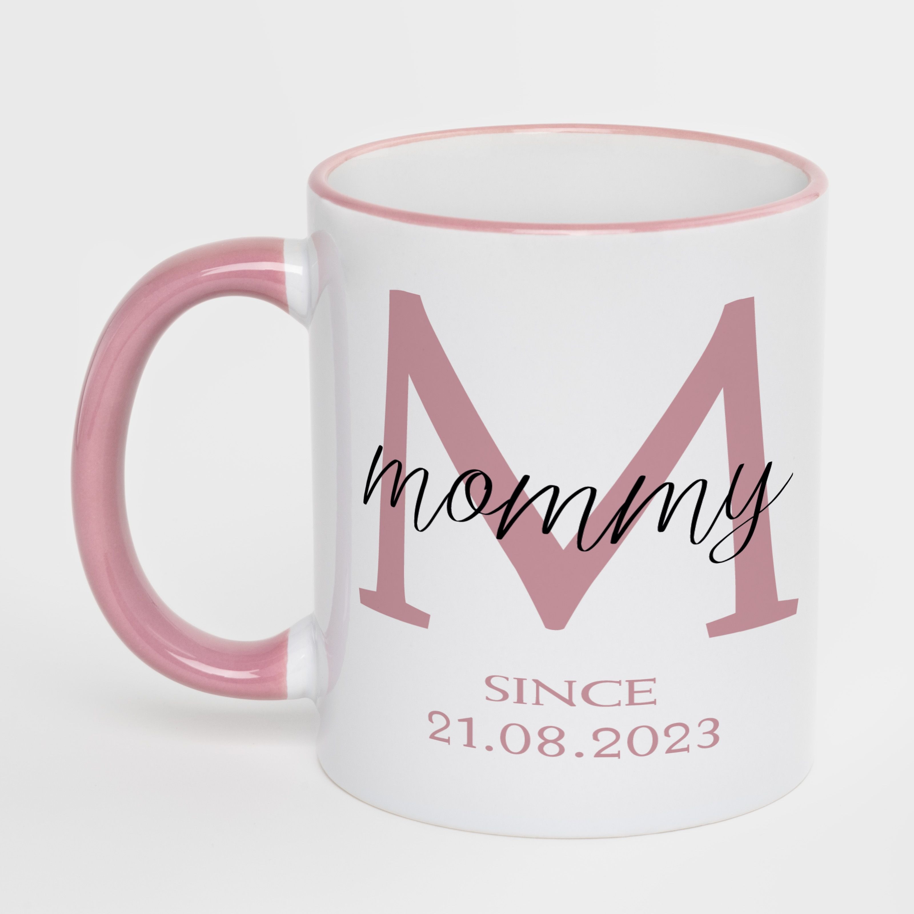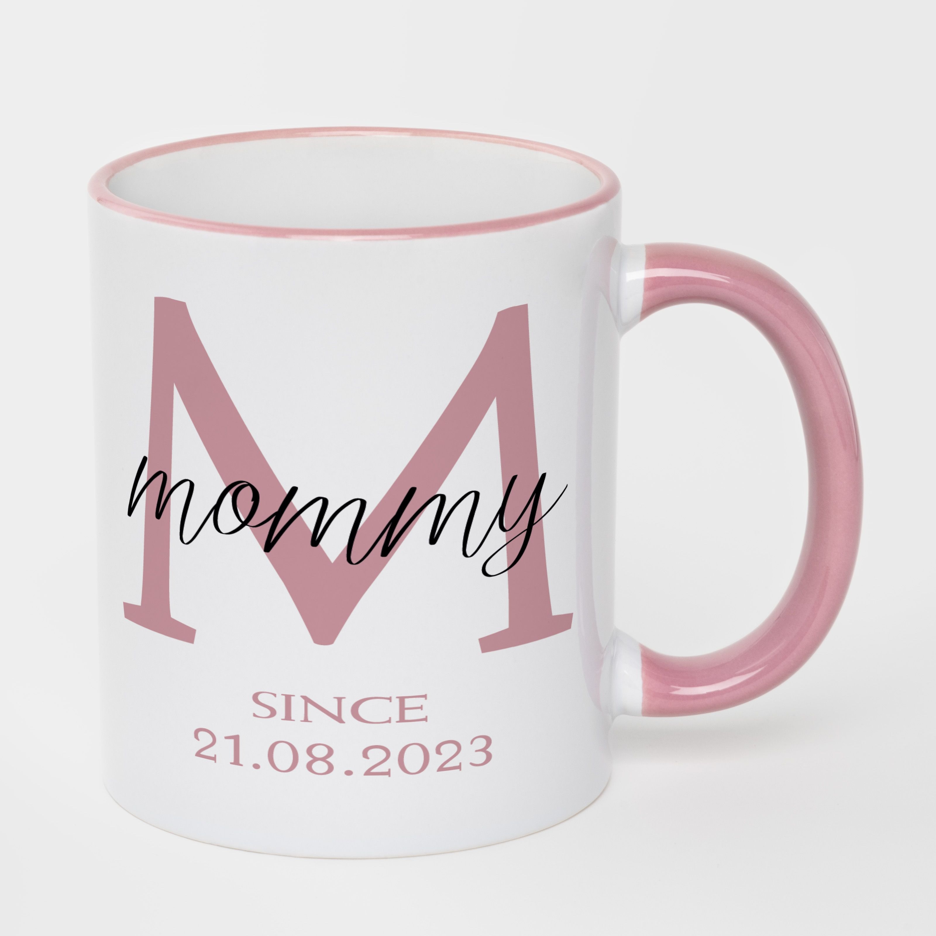 Кружка с розовым ободком и розовой ручкой (330 мл) с вашей датой "Mommy"