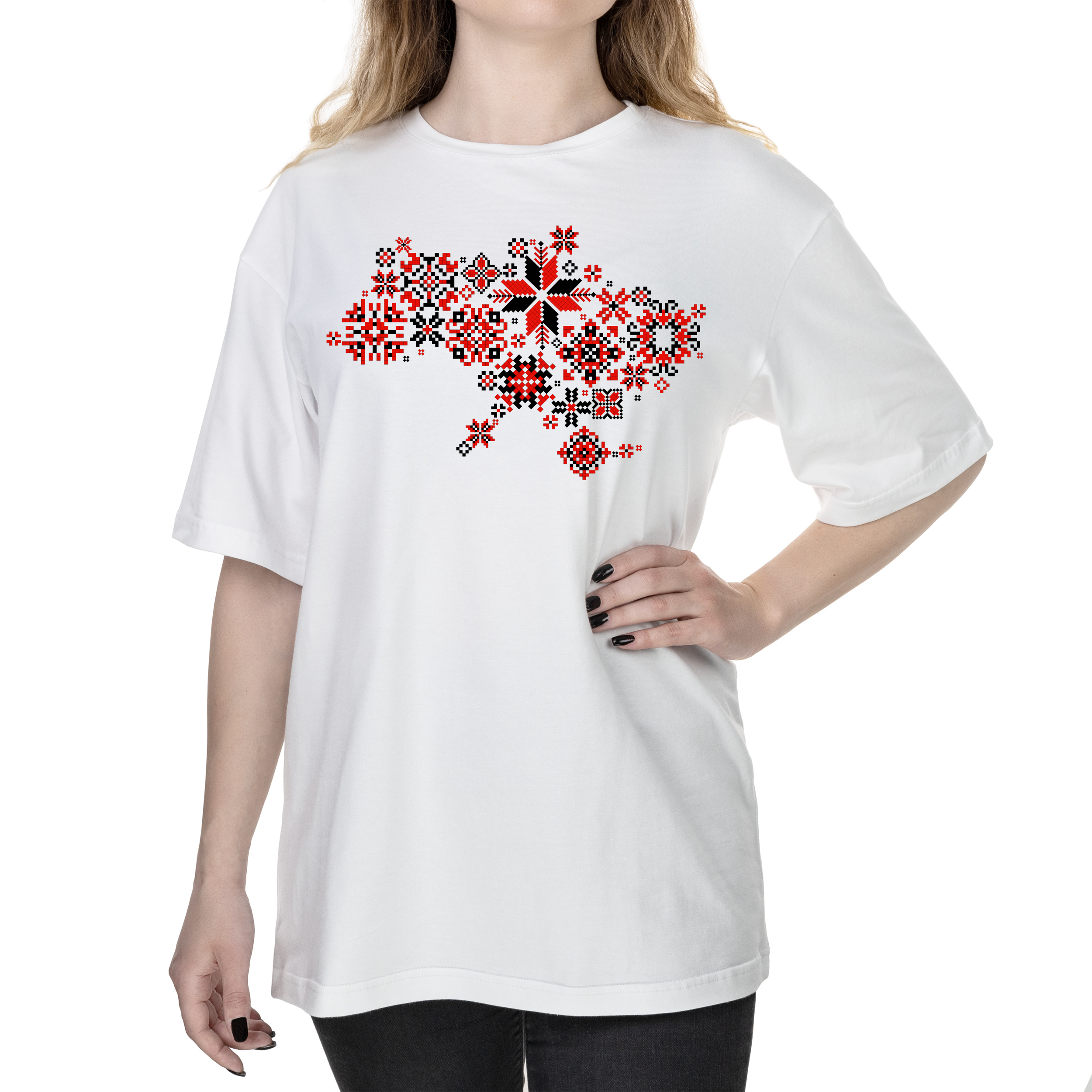 Футболка женская оверсайз белая хлопок/эластан А4 размера Карта України — вишивана S