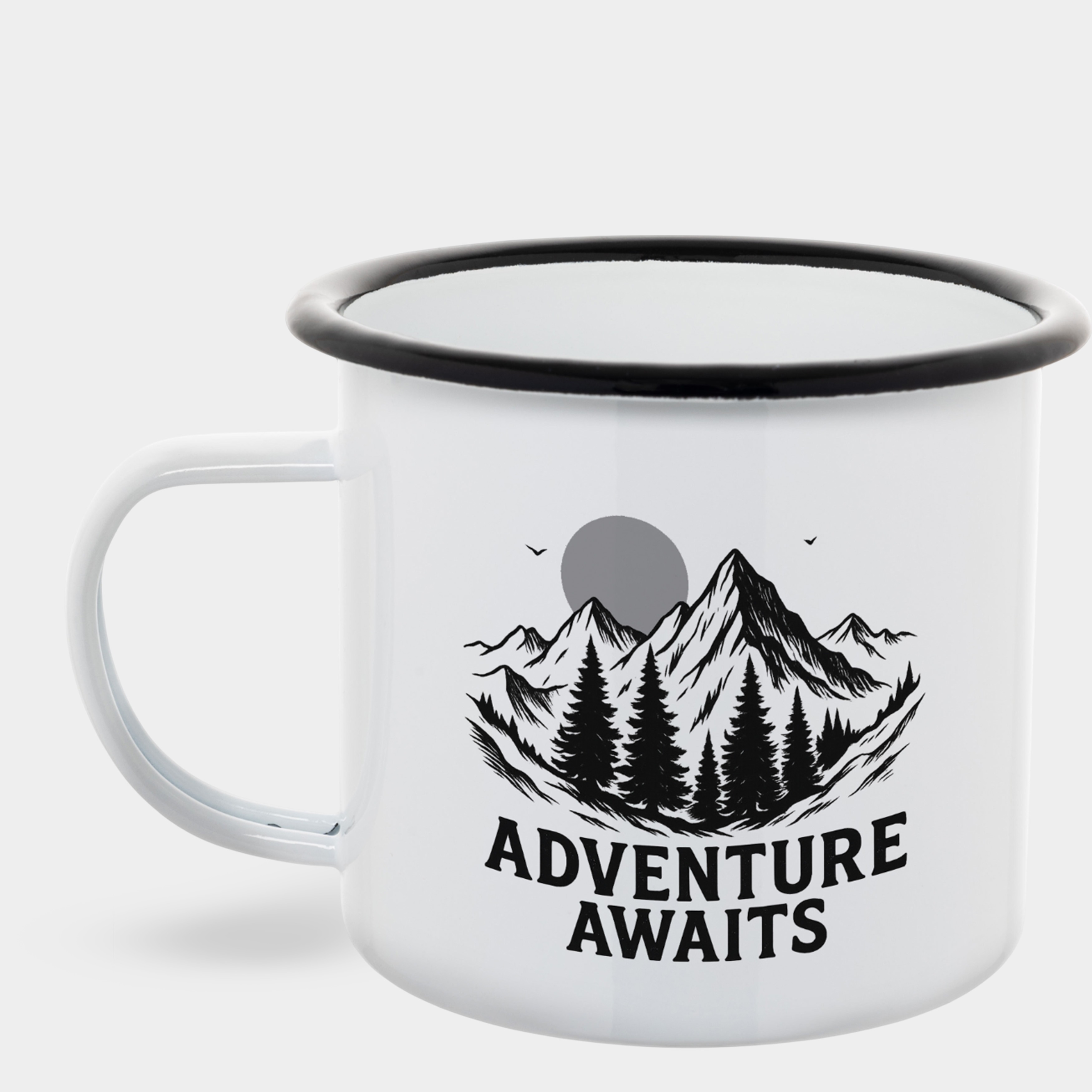 Чашка металева емальована біла з чорним обідком (500 мл) Adventure awaits